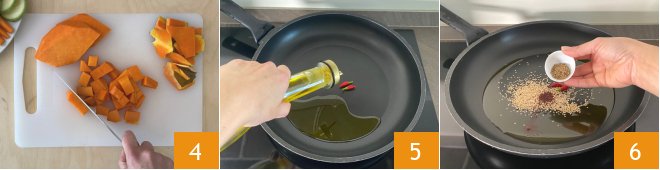 Peel the pumpkin and cut it into large cubes 4. In a large pan, pour the oil, add the chili peppers 5 and the spices 6.