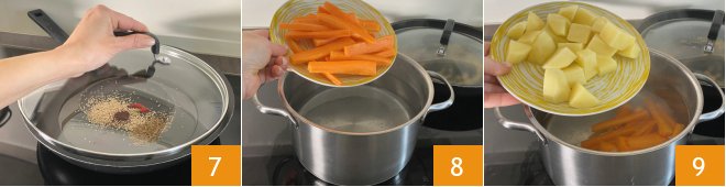 Cover the pan and sauté for a few minutes 7. Meanwhile, bring some salted water to a boil. Drop in the carrots 8 and potatoes 9 into the boiling water and cook them for 10 minutes.