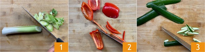 To make the spicy chicken noodles, first clean and cut the vegetables: slice the leek into rounds 1, then cut the bell pepper 2 and zucchini 3 into strips.