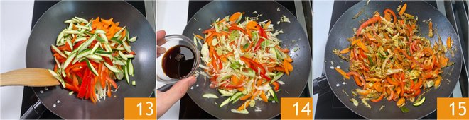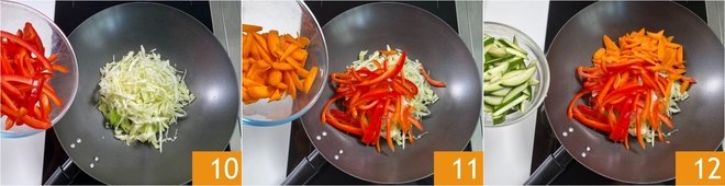 Add the cabbage, bell pepper 10, carrots 11, and zucchinis 12.
