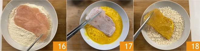 Now prepare the chicken: coat the chicken slices first with flour 16, then with beaten eggs 17, and finally with panko 18.