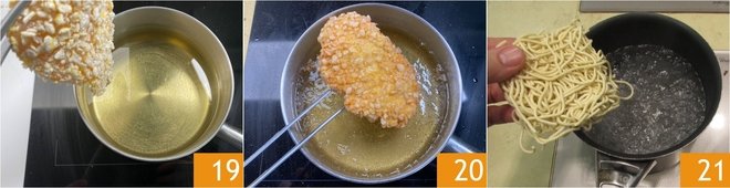 Heat the vegetable oil to 338°F, immerse the breaded slices 19, and fry for 3-4 minutes until golden. Drain 20 and set aside. Meanwhile, bring a pot of water to a boil and blanch the noodles for one minute 21.