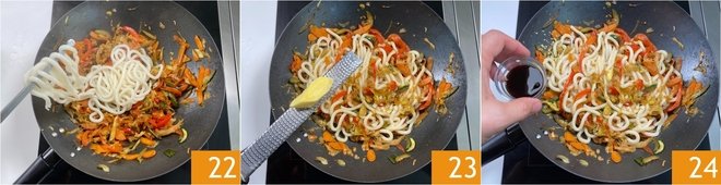 Transfer the noodles to the wok 22, grate the fresh ginger 23, and add the remaining soy sauce 24.