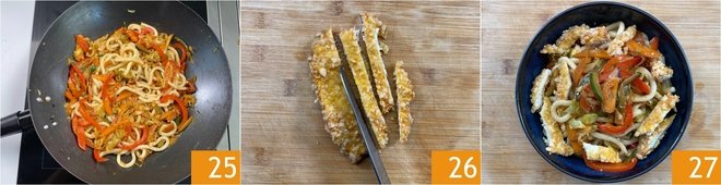 Stir-fry everything for a minute 25. At this point, cut the crispy chicken into slices 26 and serve it with your spicy noodles 27!