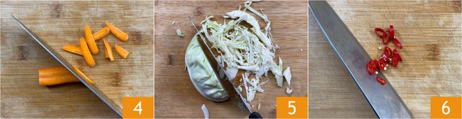 Slice the carrot lengthwise and then thinly slice it diagonally 4, then cut the cabbage into strips 5 and the chili into rounds 6.