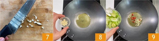 Finally, mince the garlic 7. Heat the vegetable oil in a wok, then add the garlic 8, chili, and leek 9.