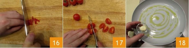 Finely chop it 16, then wash the cherry tomatoes and cut them into 4 parts 17. Sauté a clove of garlic in a non-stick pan with a drizzle of extra virgin olive oil 18;