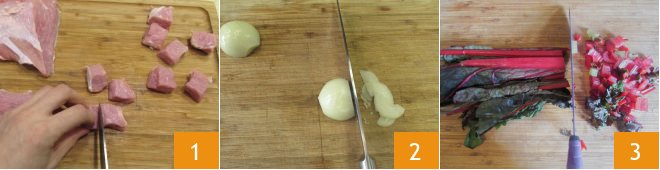 To prepare the spicy pork stew with lentils, first cut the loin into cubes of about 1 inch 1, then thinly slice the onion 2 and chop the herbs into small pieces 3.