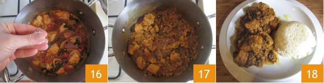 Salt 16 and cook over low heat for about an hour: the consistency should be saucy but not liquid 17. Serve your spicy pork stew with lentils accompanied with basmati rice 18!