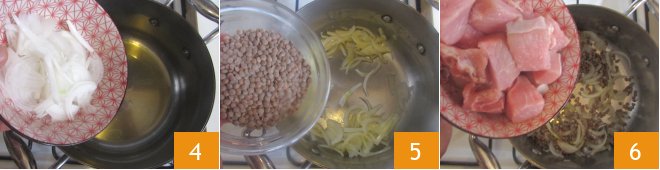 Pour a drizzle of oil into a saucepan, add the onions 4, and sauté over low heat until softened, stirring often. At this point, add the lentils 5 and toast them for a few seconds, then add the meat cubes 6 and brown them on all sides.