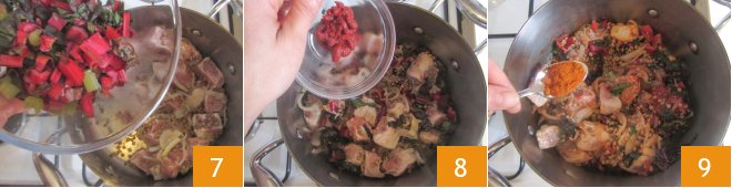 Add the herbs 7, then season with tomato paste 8 and chili pepper 9.