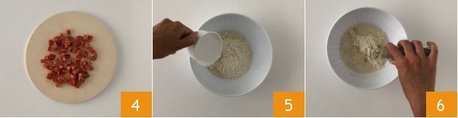 Finally, add the instant yeast 7, mix to combine the ingredients well, and you should have a smooth and slightly runny batter 8. At this point, add the salami cubes 9