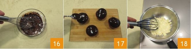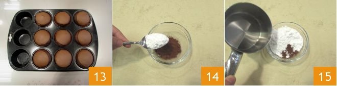 Once ready, take them out of the oven and let them cool. Then prepare the chocolate glaze: in a saucepan, heat the water, then in a bowl, add the cocoa powder and powdered sugar 14 and pour in the hot water 15,