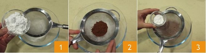 To prepare the chocolate and condensed milk spiderweb cupcakes, first, in a bowl, sift together the flour with the potato starch 1, the unsweetened cocoa powder 2, and the baking powder 3.