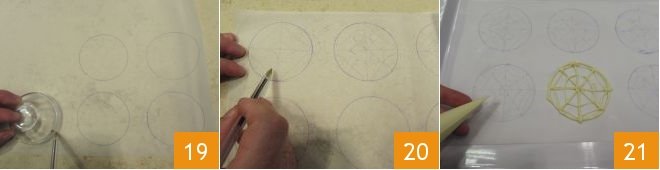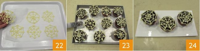 then take a sheet of parchment paper and, on the dull side, use a pen to trace the circumference of a bowl or a glass with a diameter of 2.75 inches 19, then begin to draw the spiderweb: starting from the circle's diameter, draw 8 equal sections, then from the outside, connect two sections at a time by drawing small arches: you will need three for each section to simulate the spiderweb's mesh 20. Transfer the white chocolate into a piping bag, turn the parchment paper over, and following the drawing, create the decoration with the white chocolate 21. Once you've finished the spiderwebs for all the cupcakes, place them in the freezer to solidify for about half an hour.