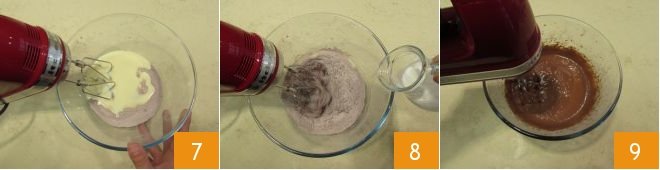 Turn on the mixer, then pour in the milk 7 and start mixing 8 and continue to mix 9.