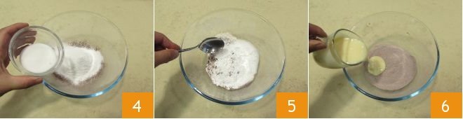 Add the sugar 4, mix everything with a teaspoon 5, and add the condensed milk 6.