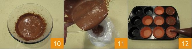 until you achieve a smooth and homogeneous mixture. Transfer the mixture into a disposable piping bag 11 to which you can cut the tip. Take a muffin tin, line it with paper liners, and fill them with about 1.4 oz of batter each 12. Bake them in a preheated static oven at 350°F for 30-35 minutes (or in a convection oven at 320°F for about 20-25 minutes).