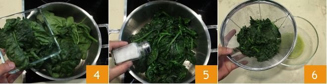 add the spinach 4 cover with the lid and cook for 4-5 minutes until they soften. Salt 5 and pepper to taste. Place the spinach in a fine mesh sieve, squeeze the spinach with the back of a spoon and let the excess liquid drip into a small bowl 6.