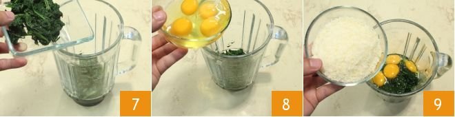 Now pour the spinach into a blender 7, add the whole eggs 8, the grated cheese 9,