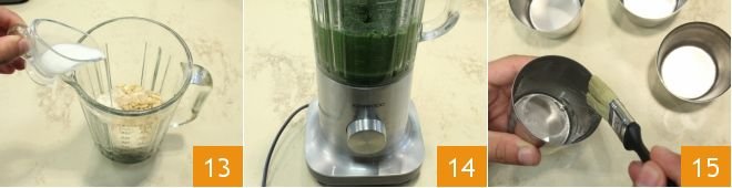 and finally the milk 13, turn on the blender to mix the ingredients until you get a creamy mixture 14. Butter 4 steel molds with a capacity of 1/2 cup 15 alternatively you can use disposable aluminum molds.
