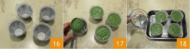 and line them with parchment paper, cutting a circle for the bottom and strips for the edge to fully cover the molds 16. Pour the spinach mixture with a ladle filling each mold to the edge 17. Now proceed with cooking: place the molds in a high-sided baking dish, pour water into the dish covering the molds by an inch or so 18. At this point, bake in a preheated static oven at 350°F for 25-30 minutes or in a convection oven at 320°F for 15-20 minutes.
