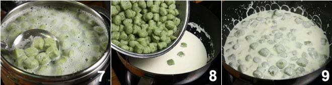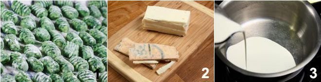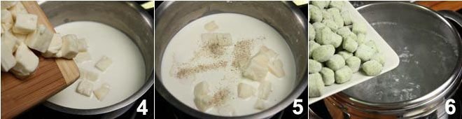 Prepare the spinach dumplings 1 following our recipe found by clicking Green gnocchetti. Remove the rind from the taleggio and cut the cheese into pieces 2; pour the cream into a pan 3