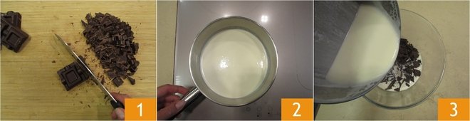 To prepare the Spoon Sacher, start with the ganache. Chop the dark chocolate 1 and transfer it to a bowl. Heat the cream until almost boiling 2 and pour it in three batches into the bowl with the chocolate 3.