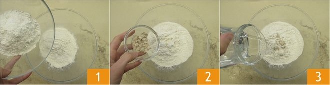 To prepare the spring focaccia, start with the dough. In a bowl, combine the flours 1, the crumbled yeast 2, and all the water 3.