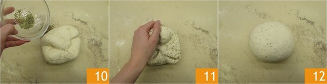 Add the 3 dried herbs as well 10 and knead for another 5 minutes or so 11, or until the dough is smooth and homogeneous 12.