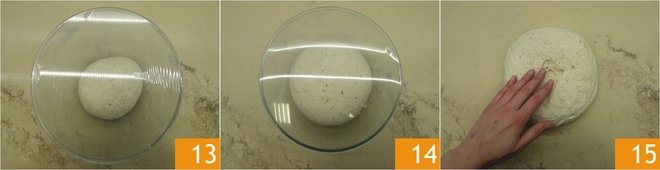 Place it in a bowl and cover with clingfilm 14, let it rise at room temperature for about 2 hours or until doubled 14. Transfer the dough onto the work surface and flatten it slightly with your hands 15.