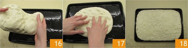 Transfer it to a previously greased 10x7 inch baking tray 16. Spread the focaccia by stretching the dough with your fingertips 17 and gently pulling it until it covers the entire surface 18.