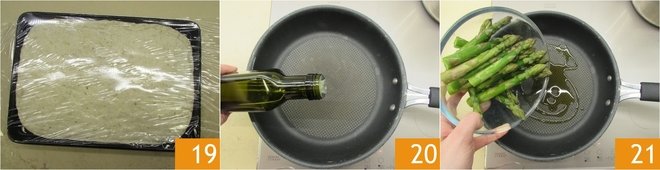 Cover with clingfilm 19 and let it rise again for about 30 minutes at room temperature. In the meantime, prepare the asparagus. Pour a drizzle of oil into a pan 20 and add the frozen asparagus 21.
