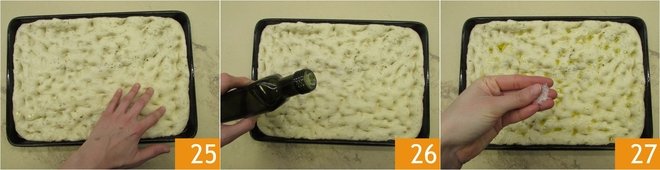 Now, with oiled hands, make the classic dimples in the dough, pressing gently 25, then sprinkle with oil 26 and flakes of salt 27.