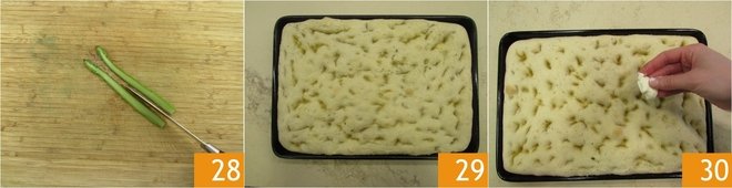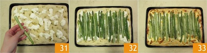 At this point, bake in a preheated static oven at 375°F for 20 minutes. Meanwhile, cut the asparagus in half lengthwise 28. After the first 20 minutes, remove the focaccia from the oven 29 and cover it with the stracchino, tearing it with your hands or with a spoon 30.