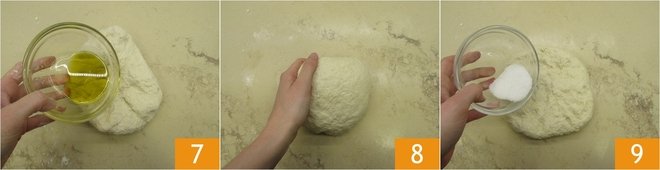 At this point, add the oil in three stages 7, adding more only when the first dose has been absorbed by the dough. Once all the oil is absorbed 8, add the salt 9 and knead until it is well incorporated.