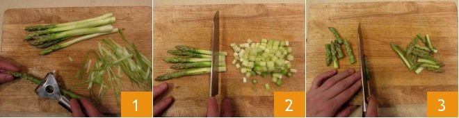 To prepare the spring omelette, start by washing all the vegetables under plenty of fresh running water. Scrape the stalks of the How to clean asparagus with a vegetable peeler to remove the tougher outer parts 1, then cut the stalk into cubes of about 1/5 inch 2 and the tips in half 3.