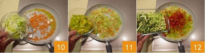 When the garlic is golden, remove it from the heat and add the carrots and leek 10, cooking for 2 minutes and seasoning with salt and pepper. Add the yellow 11 and red peppers, along with the asparagus 12