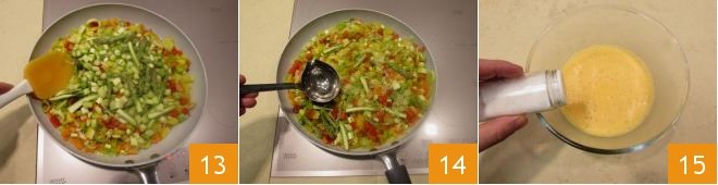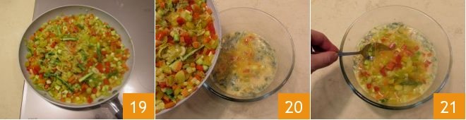 Once the vegetables are ready 19, turn off the heat and add them to the beaten eggs 20, mixing well with a teaspoon 21.