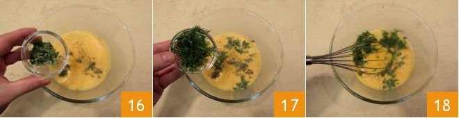 Add the herbs as well: thyme, marjoram 16, and fennel 17. Stir with a whisk to mix all the ingredients 18.