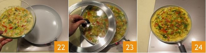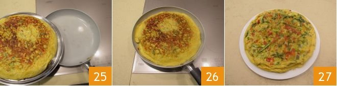 Pour everything into a 11-inch diameter non-stick pan 22 and cook covered with a lid 23 for 6-7 minutes over moderate heat 24. With the help of the lid, flip the omelette to cook it on the other side for about 3 minutes 25. Once ready 26, turn off the heat and serve your spring omelette 27.