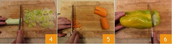 Finely slice the leek 4, then peel the carrots and cut them into cubes of about 1/5 inch 5. Continue cleaning the peppers: remove the top part 6,
