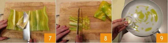 then with a knife, remove the white filaments and seeds found inside 7; then cut them into cubes of about 1/5 inch 8. Place a non-stick pan with oil and a garlic clove 9 on the stove.