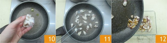 Meanwhile, in a non-stick pan, pour a little oil and heat it. Add the reserved heads and squid tentacles 10 and brown them. Turn them occasionally 11 and when well browned on all sides, transfer them to a bowl and set aside 12.