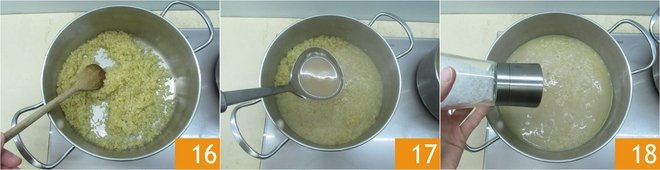 Stir and toast it for a few minutes 16. Deglaze with the squid broth 17 and continue cooking, adding more broth as needed. Halfway through cooking, season with salt 18.