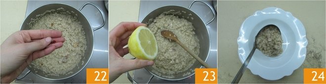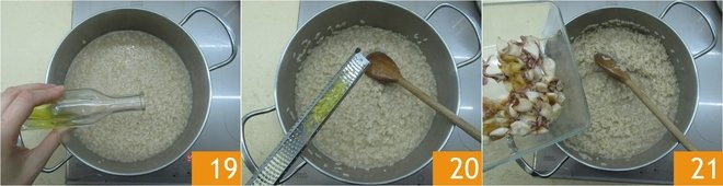When the rice is cooked, turn off the heat. Stir in a drizzle of oil 19. Add the grated lemon zest 20 and the squid, reserving some for decoration 21.