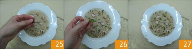 Decorate with the reserved squid 25, finely chopped chives, and sprigs of chervil and tarragon 26. Finish with a sprinkle of pink pepper 27 and serve your risotto hot 27.