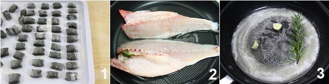 Then prepare the sea bass and saffron sauce by placing the fish, scaled, gutted, and head removed, in a pan with very little water to ease skinning 2. Once scalded, peel them, cut them into cubes, and place them in a pan with butter, a clove of garlic, and rosemary 3.