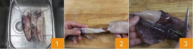 To make the squid with olives, start by cleaning the squid following our cooking school guide: Cleaning Squid. Rinse the squid under running water 1, then gently detach the head from the body with your hands and set it aside 2. Also remove the transparent cartilage pen found in the body. Rinse the squid again under running water and remove the innards. Finally, remove the outer skin 3.