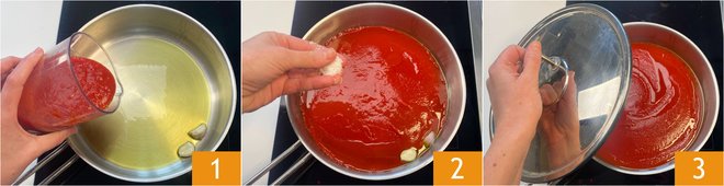 To make stale bread gnocchi, start by preparing the sauce: in a saucepan, heat some oil with 2 cloves of garlic, then add the tomato puree 1 and a little water, just enough to rinse the jug. Add salt 2, stir, and cover with the lid 3. Cook on low heat for about 40 minutes, stirring occasionally.